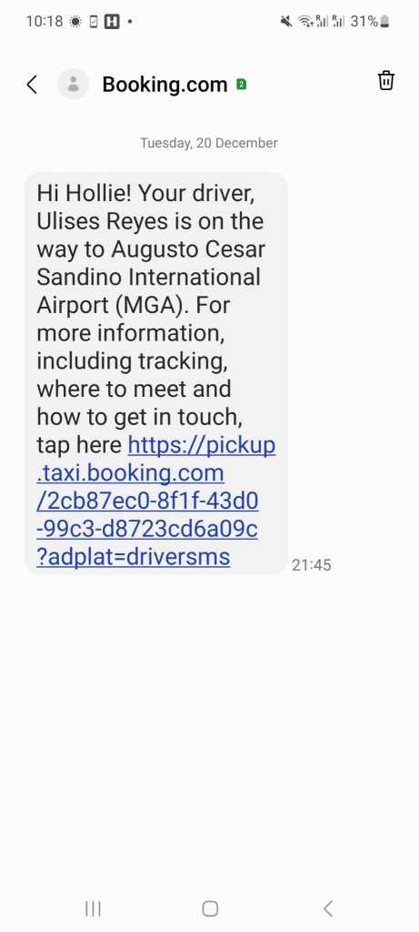 So let’s start off with the fact we only started to think about booking our airport transfer from Managua – Nicaragua about 30 minutes before our first flight out of Mexico. I emailed the hotel with hopes of a magic instant reply, but failing this Hollie booked a transfer on Booking.Com … however she accidentally booked it for a hotel that was 17 minutes away from the airport.