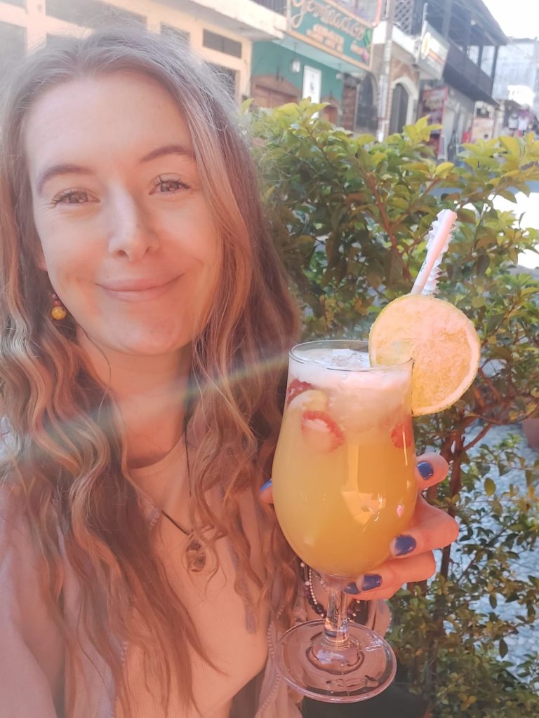 We found a cafe, plugged in our power banks to charge and ordered a tequila sunrise, what better drink to get at 10.30am, and for only £2.61 – BARGAIN.