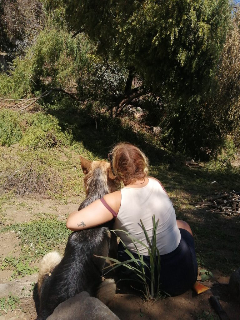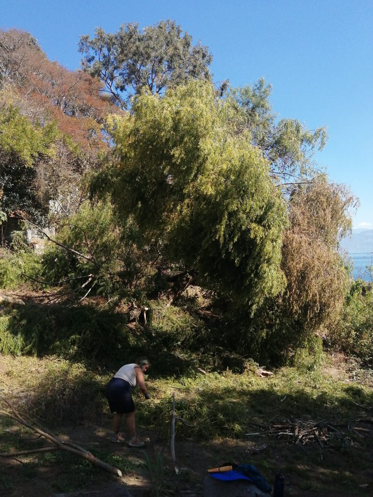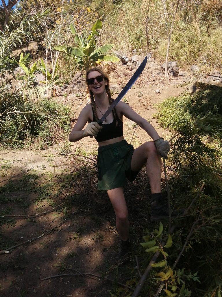 By Friday we had finished the work on the hill – REJOICE! So now we are working at cutting up the tree that fell down! Allysio made it look like light work with the machete, but it took us a fair few chops to get the branches off. All the machete work called for a sit down and some cuddles with Mirpa.