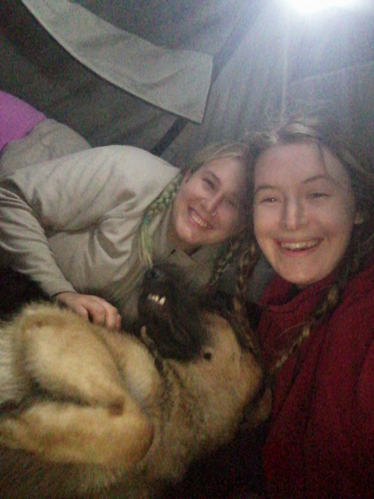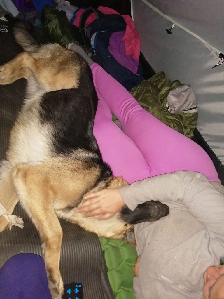Hollie and I retired to the tent earlier than usual, and played some card games. We then heard a very sad Mirpa outside the tent, She has been dying to get in, and we had agreed that on our last night we would let her in (because she is so dusty) – however, we couldn’t resist her sad face and so invited her in for cuddles. Mirpa enjoyed her stay with us for about 20 minutes, then she headed back outside, and we wet wiped my roll mat… so I imagine we will be seeing more of her in our last week!
