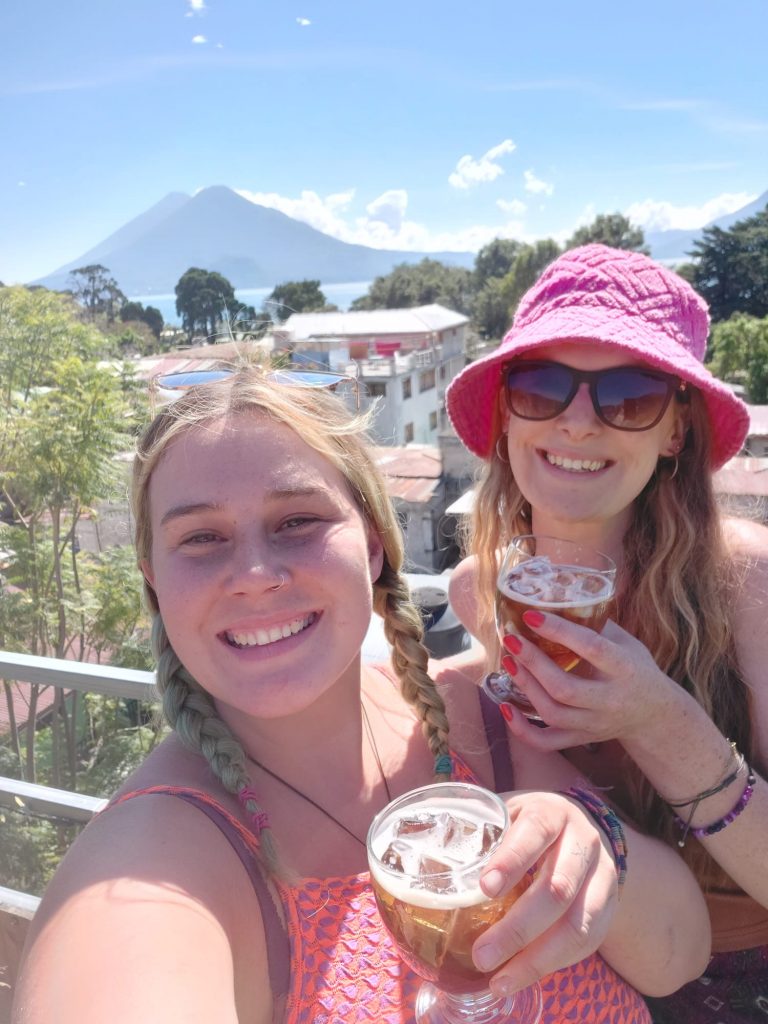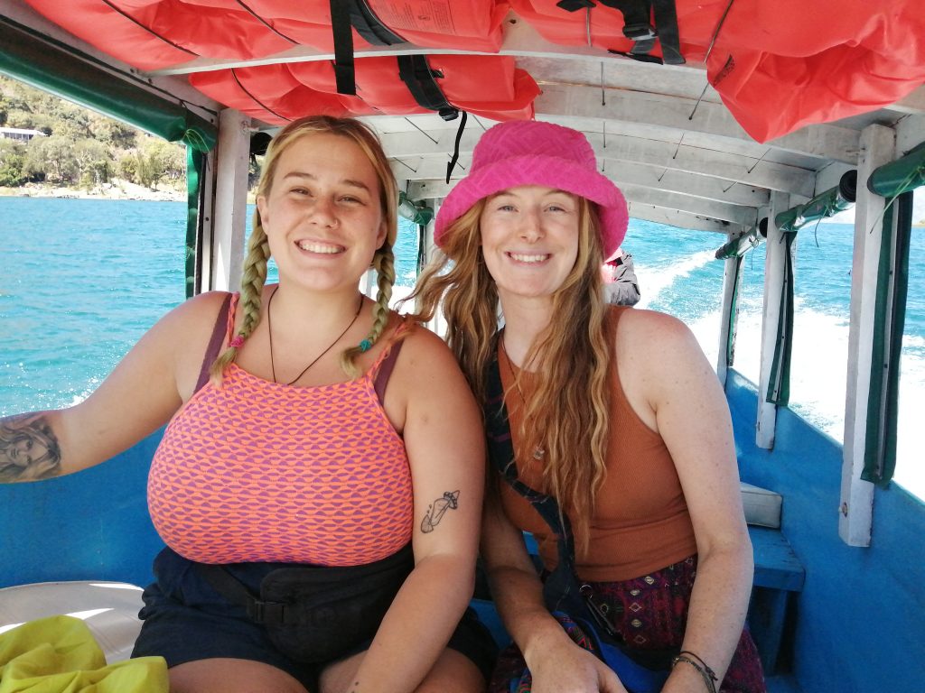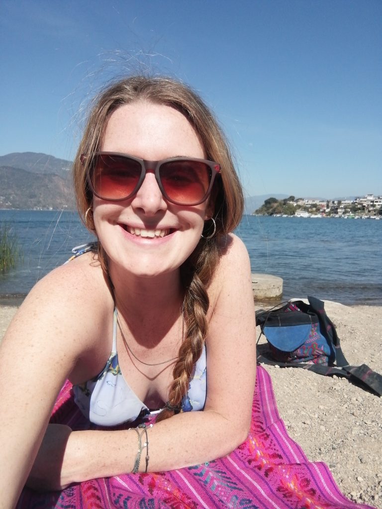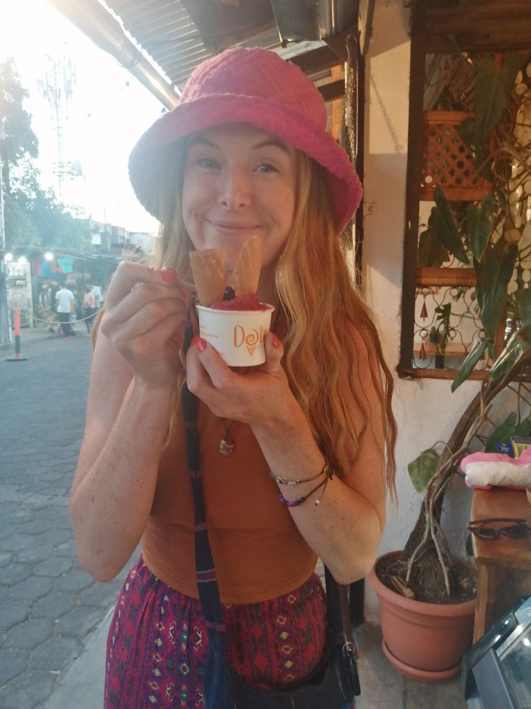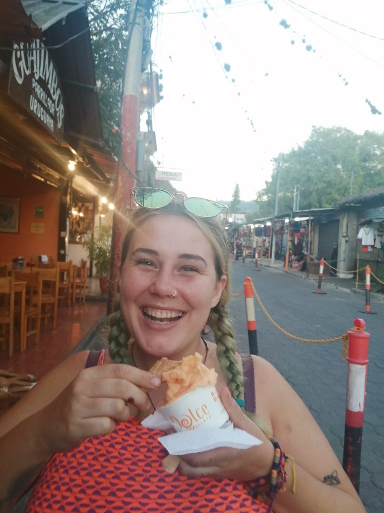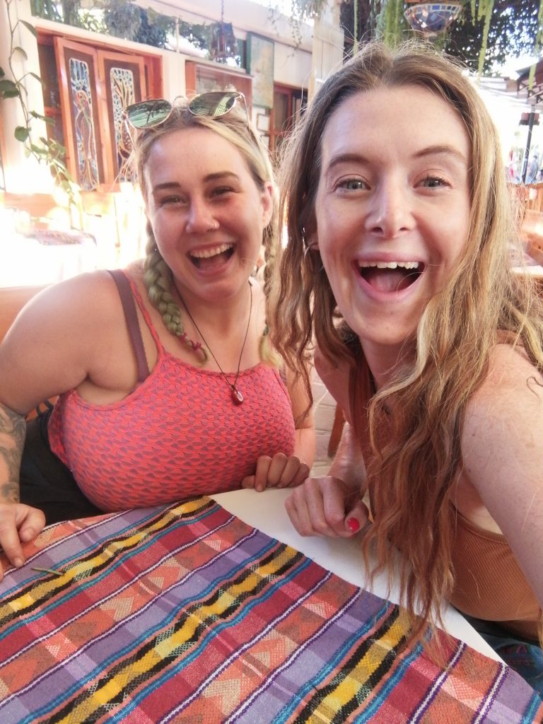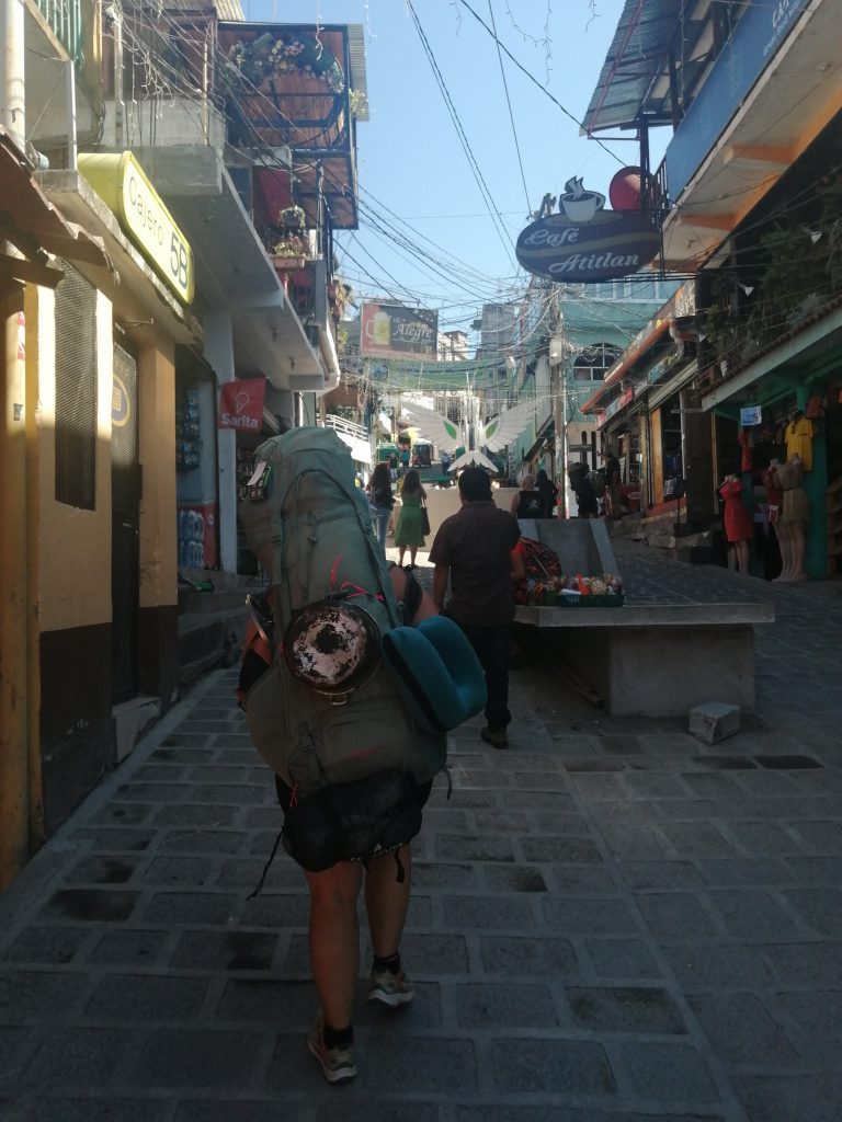 Huge rucksack on our back, small rucksack on our front and a bag full to the brim with washing in hand, we bought our ticket to Panajachel, and boarded the boat. They put Hollie’s bag on the top of the boat like last time, but placed mine in the boat. The boat was ripping through the waves, they were coming up very high past the windows, so we were very concerned about Hollie’s bag. I was able to enjoy the thrill of the boat ride knowing that my bag was safely inside. THANKFULLY when we arrived it turned out Hollie’s bag was inside the whole time! We stepped off the dock, bought a beautiful mango on a stick with all the trimmings (pepitoria, salt, lemon and chile ) and made our way to the Dreamboat Hostel.
