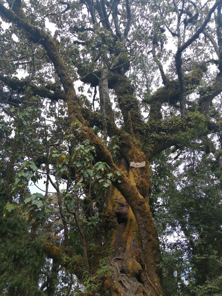The steps were surrounded by fields and I had to take a moment to remember to take in the scenery. Up the stairs we went, and into the depths and cool of the trees. Onto a windy upright path, we had finally made it past the first hurdle and regrouped at the registration point. Here we got a wrist band, had to sign a tourist form, I ate a banana and gawked at a HUGE tree!