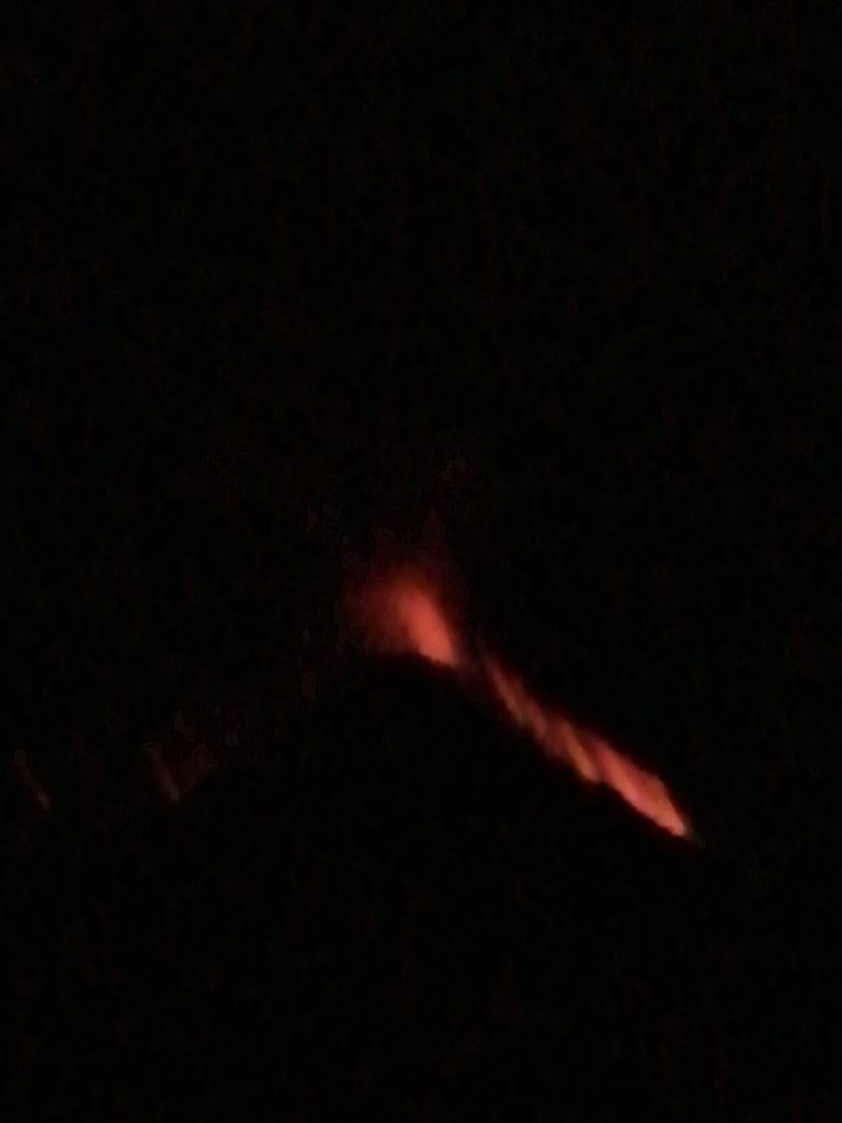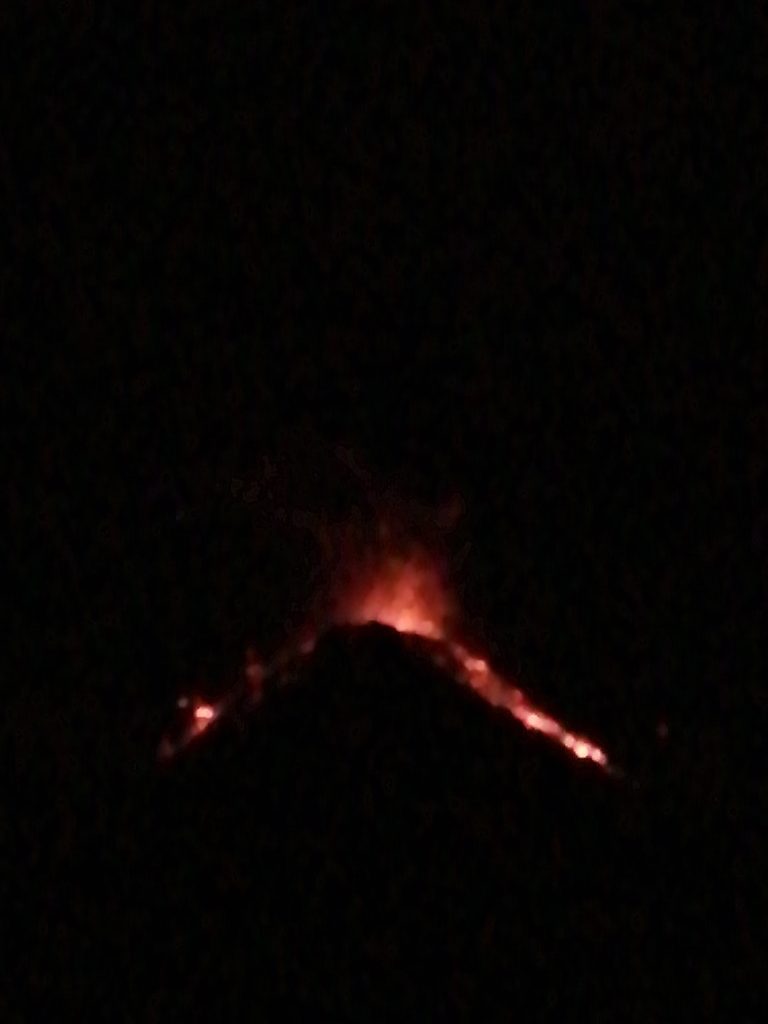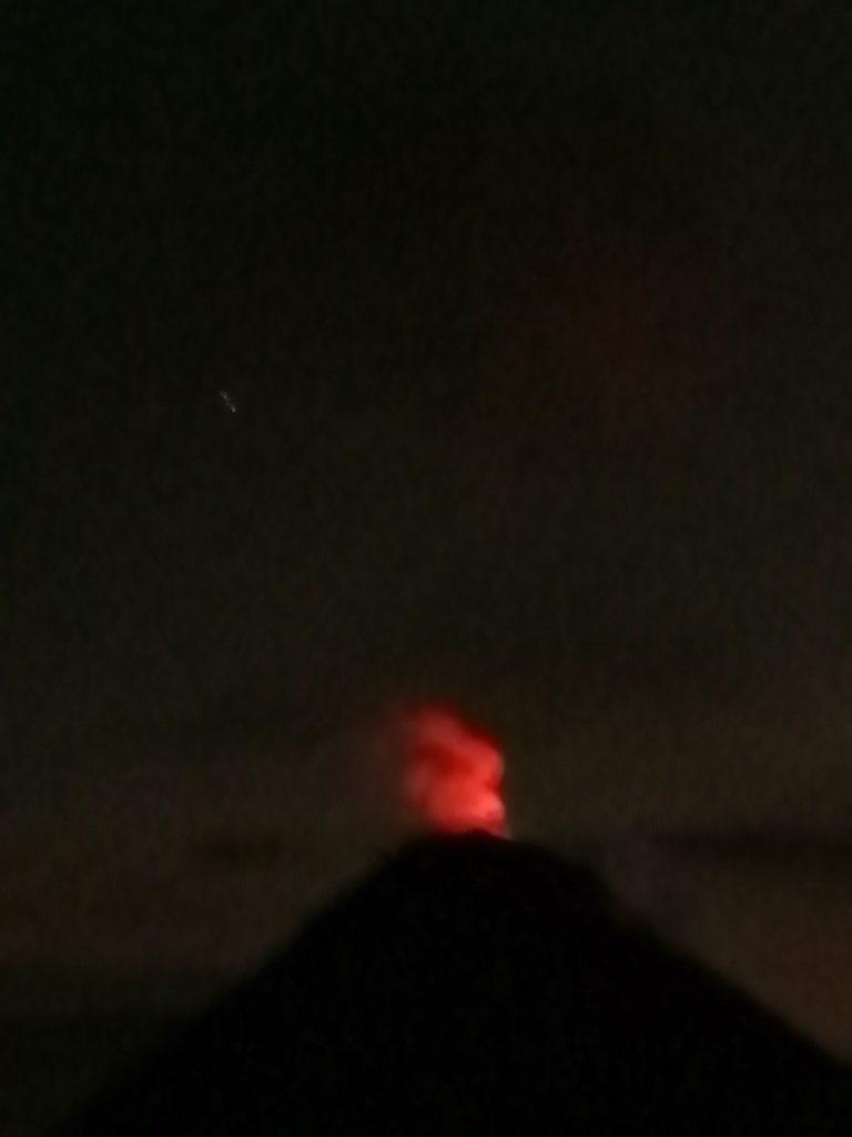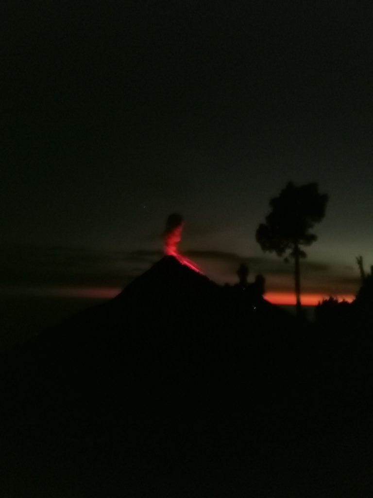The pinkness turned to darkness, and we sat around the fire to keep warm. There was only a handful of us who didn’t hike to Feugo, so we all sat and enjoyed the views of the golden lava eruptions. We could usually tell when they were happening, as the base camp below us would roar with ‘OOOOOsss’ and ‘AAAAAhhhhsss’. The sights were truly spectacular and worthy of every gasp. I can only apologise for how terrible these pictures are, I knew I should have got a new phone before travelling, but didn’t want to in fear of it getting stolen … but Central America has been so safe so far, the only crime being committed is the quality of these images.